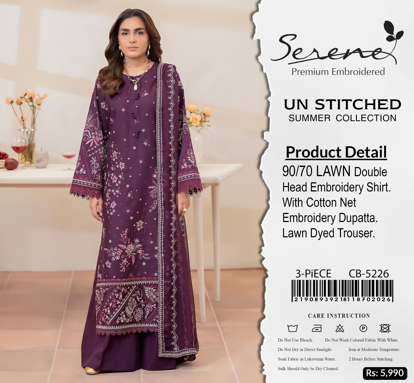 Serene 90/70 Premium Embroidered Lawn - 3 piece unstitched Summer Collection